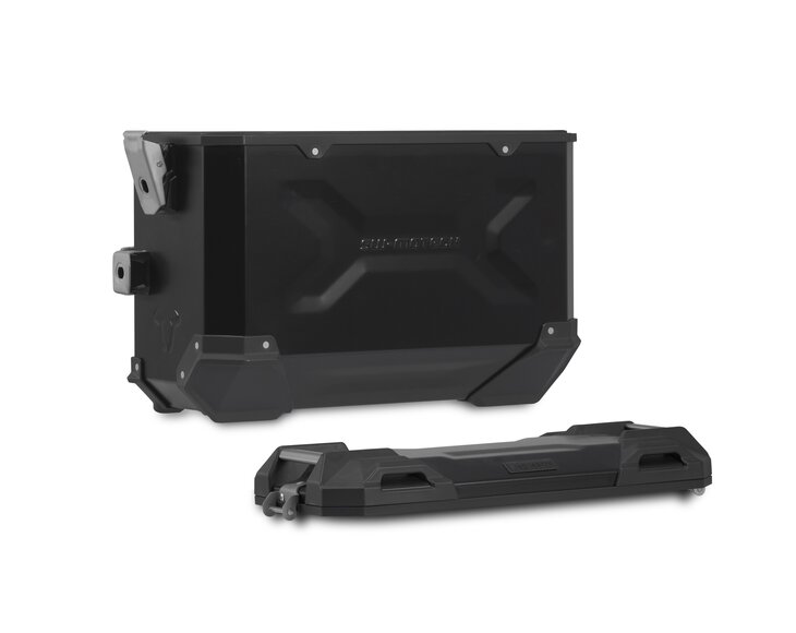 Durable TRAX ADV aluminum cases feel at home on any stretch of road: embossed patterns add stability to the 1.5 millimeter-thick, welded aluminum wall material. A completely removable lid with carrying handles made of anodized aluminum and quick release fasteners makes loading and unloading of motorcycle luggage easier; the beveled side edge provides high ground clearance when cornering. With this complete solution, you have all the components you need to travel with TRAX: two waterproof TRAX ADV side cases, two detachable SW-MOTECH side carriers, adapter kit, lock set, lid limiter and anti-theft protection at an attractive price.